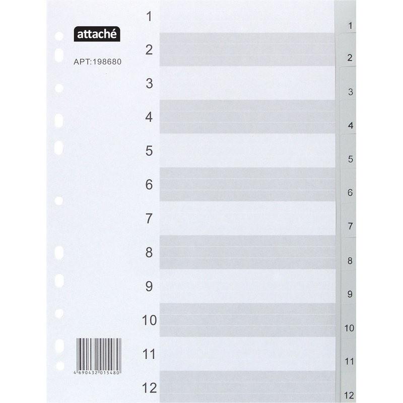 Разделители - это отличный вариант для систематизации документов внутри папок разного вида. Они помогают сортировать информацию в том виде, как нужно именно Вам. Разделители листов Attache формата А4 серого цвета, облегчающие систематизацию архивных и текущих документов. Размер - 290x210 мм. Выполнены из прочного пластика толщиной 120 мкм. Имеют универсальную перфорацию для подшивки в папки. Разделители листов включают цифровой индекс на 12 разделов. Разделители подходят по размеру для файлов и для листов. Табулятор будет видно между файлами.