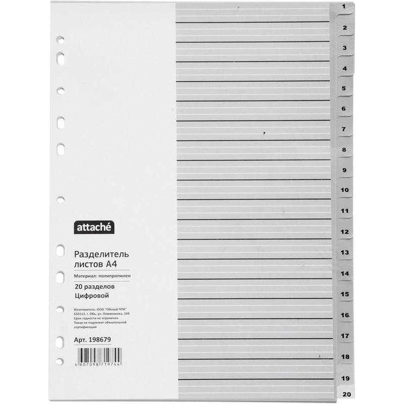 Разделители - это отличный вариант для систематизации документов внутри папок разного вида. Они помогают сортировать информацию в том виде, как нужно именно Вам. Разделители листов Attache формата А4 серого цвета, облегчающие систематизацию архивных и текущих документов. Размер - 290x210 мм. Выполнены из прочного пластика толщиной 120 мкм. Имеют универсальную перфорацию для подшивки в папки. Разделители листов включают цифровой индекс на 20 разделов.