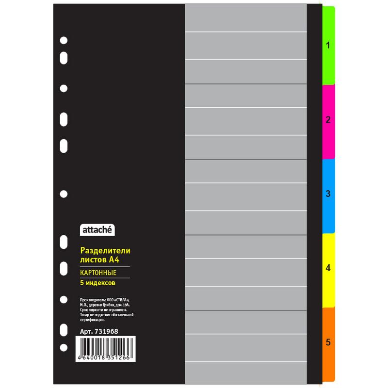 Разделители - это отличный вариант для систематизации документов внутри папок разного вида. Они помогают сортировать информацию в том виде, как нужно именно Вам. Разделители листов Attache Selection формата А4 изготовлены из прочного картона. Размер - 297x220 мм. Плотность листов - 150 г/кв. м. Универсальная перфорация совместима с различными типами папок. В комплекте 5 листов с двусторонними ярлыками цвета 'НЕОН' и нанесением индексации, а также титульный лист для удобства и быстроты поиска. Картон - экологически чистый и пригодный для переработки материал.