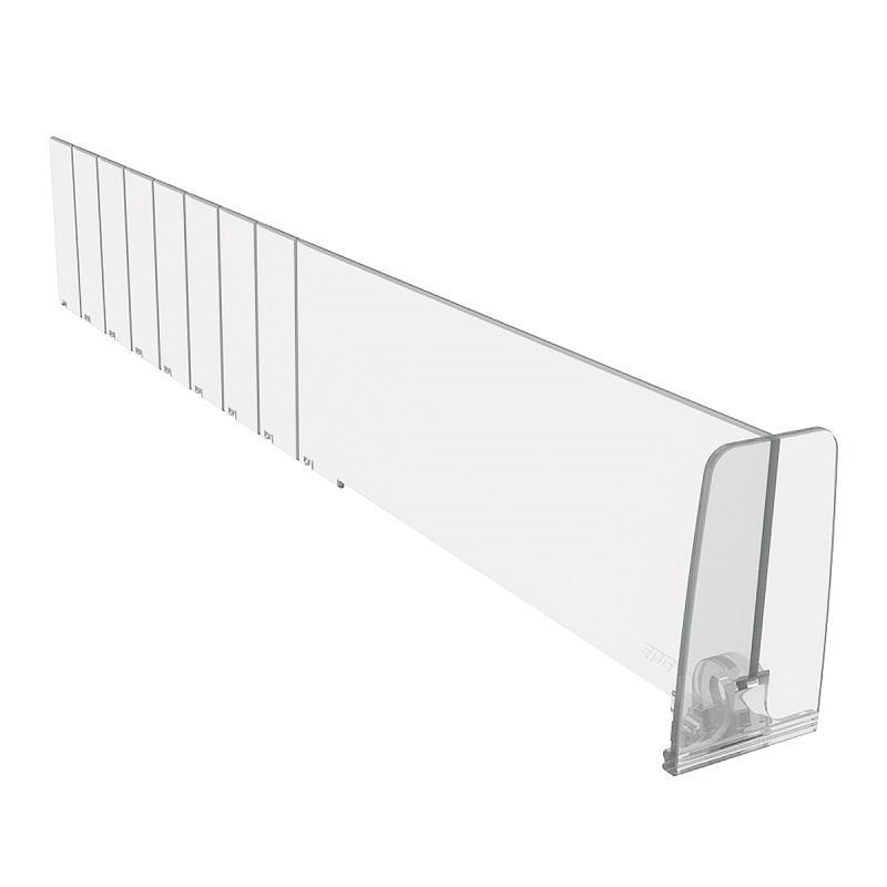 Применяется для организации на полке товаров среднего размера. Ограничитель предотвращает выпадание товара вперед, высота ограничителя 60 мм. <BR>Шаг обламывания 25 мм. Материал: прозрачный ударопрочный пластик.
