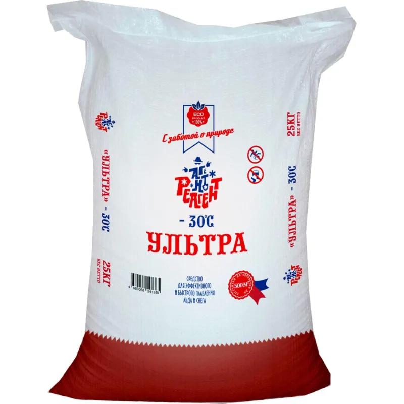 Реагент противогололёдный Mr. Defroster Ультра мешок 25 кг до −30 °С<br /> <br /> Реагент противогололёдный Ультра на основе хлорида натрия и хлорида кальция — инновационное средство для эффективного плавления снега и льда. Применяется на муниципальных территориях, дорожных покрытиях, пешеходных зонах и других объектах. В отличие от обычных реагентов, рассыпается на мелкие частицы, не образуя луж и облегчая уборку снега и льда.<br /> <br /> Этот продукт удовлетворяет высоким экологическим требованиям и отличается высокой эффективностью при температурах до −30°C. Продукт не способствует коррозии металла и является безопасным для использования на металлических и других покрытиях. 15% раствор хлорида натрия и кальция по своим свойствам аналогичен водопроводной воде. Реагент может использоваться как вручную, так и с помощью тележки-дозатора, что позволяет экономить до 30% материала. Норма расхода составляет 50 г/м².<br /> <br /> Меры предосторожности: оказывает умеренно раздражающий эффект на кожу и слизистые оболочки. При попадании на повреждённые участки кожи или в глаза промыть большим количеством проточной воды. Не употреблять в пищу.<br /> <br /> Условия хранения: хранить в недоступном для детей и домашних животных месте, в неповреждённой упаковке, в закрытых помещениях, исключающих попадания влаги. Необходимо плотно закрывать упаковку после каждого применения.<br /> <br /> Срок годности: 36 месяцев с даты изготовления при соблюдении условий хранения и целостности упаковки.
