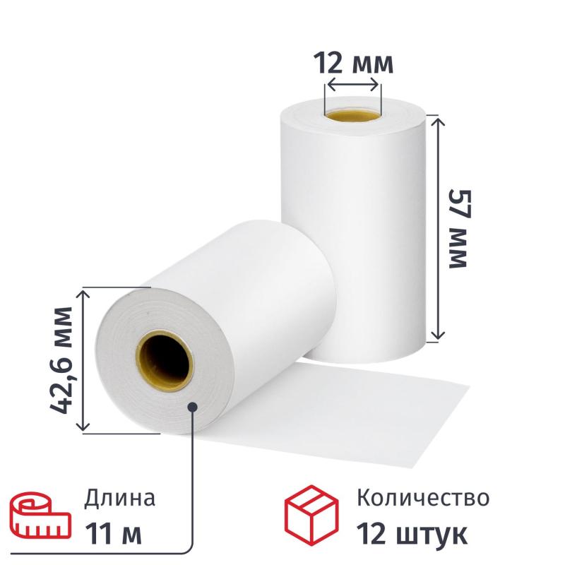 Чековая лента изготовлена из термобумаги. Бумажное полотно с наружным термослоем имеет ширину 57 мм и общую длину 11 метров. Диаметр намотки — 42.6 мм, диаметр втулки — 12 мм. Поставляются в термоусадочной плёнке и гофрокоробах. Ролики для термопечати используются в кассовых аппаратах и калькуляторах со встроенным или внешним термопринтером. Цвет печати — чёрный.