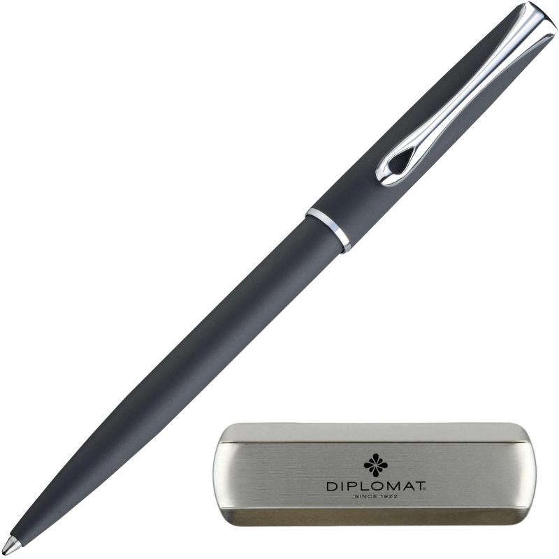 Ручка шариковая Diplomat Traveller lapis black. Серия Traveller от Diplomat — это тонкие элегантные письменные принадлежности высокого качества. Шариковая ручка Diplomat Traveller lapis black выполнена из нержавеющей стали с приятным на ощупь, очень износостойким покрытием матового черного цвета, отдельные детали дизайна покрыты хромом. Лаконичный дизайн довершают изогнутый клип и привлекательный логотип Diplomat в виде цветка на торце корпуса ручки. В ручку заправлен стержень easyFlow, обеспечивающий несравненно легкое и гладкое написание. Тонкий диаметр 9-10 мм идеально подходит для петель органайзера, а также комфортного ношения ручки при себе в кармане пиджака. Пишущие инструменты Diplomat изготавливаются и тестируются вручную, с использованием традиционных методов мастерства с 1922 г., отвечая принятому стандарту качества «сделано в Германии».<br> Комплектация: подарочная коробка, ручка шариковая Diplomat Traveller lapis black.<br> Шариковая ручка используется со стержнями Diplomat (арт. 1006798, 1006799).<br> Ручка с чернилами синего цвета (толщина линии — 0,7 мм). Ручка поставляется в элегантном, картонном подарочном футляре, размером 177×58×22 мм. Имеет высокий стандарт немецкого качества.<br> Сделано в Германии.