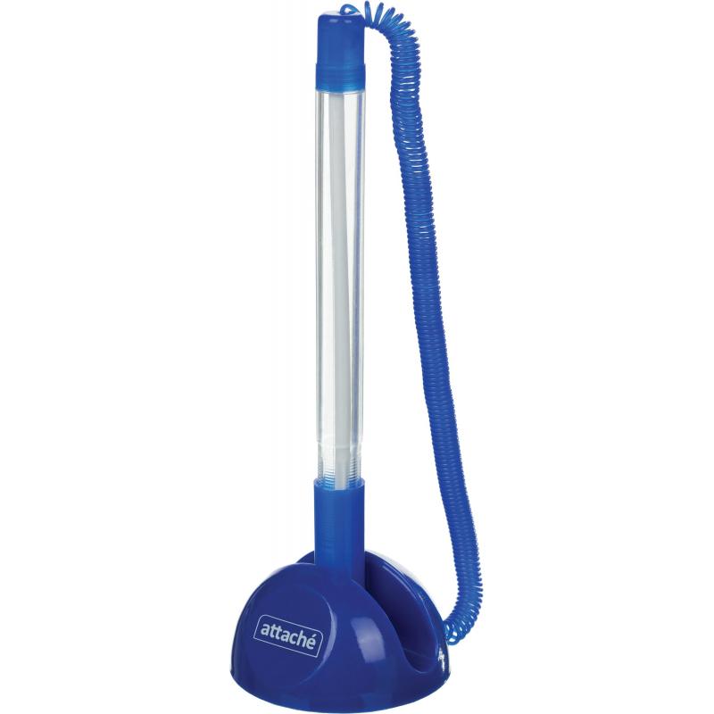 Шариковая ручка на подставке с синим цветом чернил. Модель представлена в пластиковом прозрачном корпусе с элементами синего цвета. Изделие прикреплено к подставке с помощью резинового шнура-пружины. Благодаря липкому слою на основании подставка может быть жестко зафиксирована практически на любой ровной поверхности. При письме стержень, оснащенный шариком, оставляет линию, толщина которой составляет 0,35 мм. Возможна замена стержня. Удобна для использования в офисах и различных учреждениях. Для фиксации ручки на поверхности удалите слой защитной пленки с клейкого основания.