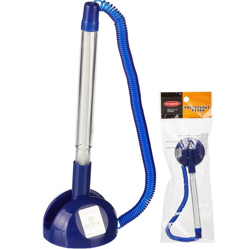 Шариковая ручка Beifa в подставке с синим цветом чернил. Модель представлена в корпусе прозрачного цвета с деталями синего цвета, выполненном из пластика. Изделие прикреплено к подставке с помощью резинового шнура-пружины. Длина пружины ручки в ненатянутом состоянии 14 см, в натянутом — 133 см. Благодаря липкому слою на основании подставка может быть жестко зафиксирована практически на любой ровной поверхности. Диаметр подставки — 45 мм, высота — 27 мм. При письме стержень, оснащенный шариком, оставляет линию, толщина которой составляет 0,5 мм. Возможна замена стержня. Дополнительные стержни для ручки вы сможете найти во вкладке «Расходные материалы». Удобна для использования в офисах и различных учреждениях. Для фиксации ручки на поверхности удалите слой защитной пленки с клейкого основания.