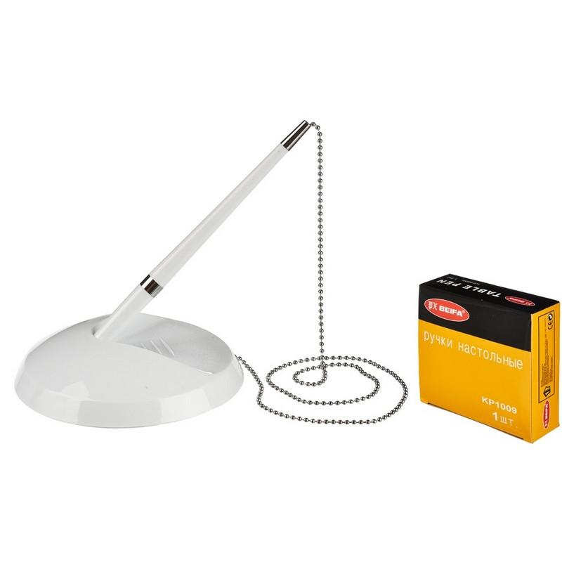 Шариковая ручка Beifa в подставке с синим цветом чернил. Модель в корпусе белого цвета с серебристыми деталями специально разработана для офисов и различных учреждений: с одной стороны крепится к 59-сантиметровой металлической цепочке, а с другой — к специальной подставке с липким основанием для установки на столах или тумбах. Диаметр подставки — 11.5 см. Ручка комплектуется сменным стержнем, толщина линии составляет 0.5 мм.<br> <br> Сменные стержни к данной ручке не представлены в ассортименте «Комус».
