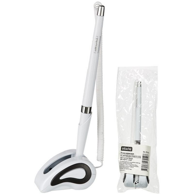 Шариковая ручка на подставке Attache с синим цветом чернил. Модель выполнена в белом металлизированном корпусе с деталями серебристого цвета. Специально разработана для офисов и учреждений. С одной стороны она крепится к пластиковой пружине, а с другой — к специальной подставке с липким основанием для установки на столах или тумбах. Можно крепить как на горизонтальные, так и на вертикальные поверхности. Толщина линии стержня составляет 0.5 мм. Длина стержня — 135 мм. Для фиксации ручки на поверхности удалите слой защитной пленки с клейкого основания.