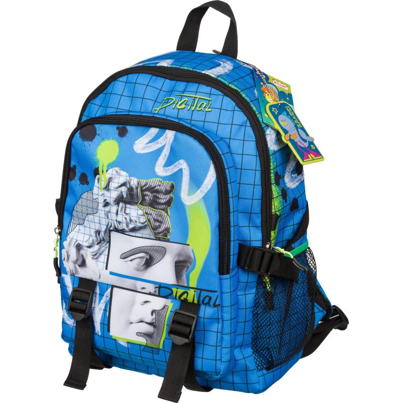 Рюкзак Комус Класс Арт 15 л синий<br><br>Эргономичная сумка для переноса учебных материалов, предназначенная для учеников средних классов и студентов. Рюкзак выполнен из полиэстера и имеет одно отделение с тремя карманами для удобного хранения различных вещей. Дизайн рюкзака выполнен в синем цвете с изображениями арт-объектов, что придаёт ему уникальный и стильный вид. Включает элементы светоотражения, которые повышают безопасность в тёмное время суток.<br><br>Размер рюкзака — 290×130×395 мм. Он не вмещает предметы формат A4. Специального отделения для ноутбука нет. Вес рюкзака составляет 465 г, что делает его лёгким и удобным для ежедневного использования.