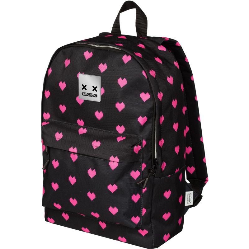 Рюкзак школьный Комус Класс Shape чёрный сердечки<br><br>Стильный молодёжный рюкзак идеально подходит для подростков. Рюкзак имеет современный и уникальный дизайн, который привлекает внимание. Он представляет собой практичный и вместительный рюкзак с одним просторным отделением на двухсторонней молнии. Снаружи находится объёмный пришивной карман на молнии для удобного хранения мелких предметов. Рюкзак оснащён ручкой и регулируемыми мягкими плечевыми лямками, что обеспечивает комфорт при носке.<br>Размер рюкзака — 410×280×125 мм. Вес изделия составляет 250 г, что делает рюкзак лёгким и удобным для повседневного использования.