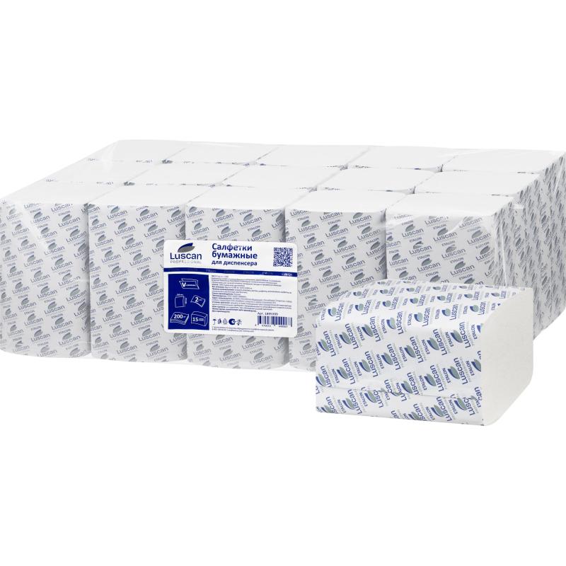 <b>Салфетки бумажные для диспенсера Luscan Professional 16.8×23 см белые 2-слойные 200 листов (15 пачек в упаковке).</b><br>Листовая подача салфеток поможет лучше контролировать расход и обеспечит максимальную гигиеничность: салфетки выдаются поштучно, что исключает соприкосновение рук со следующим листом. <br>Бумажные салфетки V-сложения — рациональное решение для мест с высокими требованиями к чистоте и гигиене. Предназначена для поддержания гигиены в местах общественного питания, различных организациях и на предприятиях.<br><b>Правила использования:</b> вскрыть упаковку, достать салфетку, использовать салфетку по назначению в диспенсере или без него.<br><br><b>Характеристики:</b><br>— состав: 100% первичная целлюлоза;<br>— белизна : 85%<br>— цвет: белый;<br>— количество слоев: 2;<br>— тиснение: да;<br>— размер листа: 168×230 мм;<br>— в пачке 200 листов;<br>— в упаковке 15 пачек.<br><br>Подходит для диспенсерной системы N4.