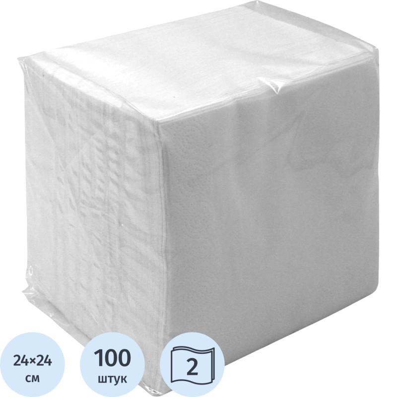 Салфетки бумажные сервировочные 2-слойные 24×24 см (100 листов в пачке)<br><br>Двухслойные салфетки выполнены в белом цвете. Прекрасно подходят для повседневного использования, в повседневном быту, на офисной кухне, на фуршетах и различных увеселительных мероприятиях, в столовых, в кафе и т.д. <br>Размеры развёрнутой салфетки: 24×24 см.<br>Изготовлены из 100% целлюлозы. <br>Поставляются пачками по 100 шт.