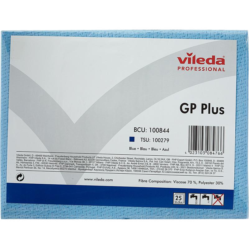 Салфетки хозяйственные повышенной впитываемости Vileda Professional GP Plus вискоза 50×35 см 62 г/кв.м синие (25 штук в упаковке)<br><br>Салфетка большого размера ДжиПи Плюс от Vileda Professional предназначена для профессиональной уборки и протирки поверхностей. Подходит для однодневного использования.<br>Для удобства уборки салфетки представлены в четырёх цветах: синий (арт. 732837), красный (арт. 732838), жёлтый (арт. 732839), зелёный (арт. 732840).<br><br>Салфетка ДжиПи Плюс эффективно очищает ежедневные загрязнения с использованием моющих средств. Подходит для ежедневной уборки любых поверхностей, в том числе столов на предприятиях общественного питания.<br>Применяется в профессиональной уборке методом ’ведро-вода’ или спрей-методом.<br><br>Особенности и преимущества: <br>— благодаря пористой структуре салфетка хорошо собирает грязь и быстро сохнет;<br>— хорошо собирает влагу и отжимается;<br>— увеличенный размер салфетки помогает убирать большую площадь за один раз;<br>— 4 цвета для цветовой кодировки и исключения перекрёстных загрязнений;<br>— салфетка рекомендована к применению как однодневная.<br><br>Область применения:<br>Идеальна для уборки коммерческой недвижимости, производств, HoReCa и клининга.<br><br>Салфетка ДжиПи Плюс — это высококачественный инструмент для эффективной, экологичной и профессиональной уборки.<br><br>Характеристики: <br>— толщина: 0,95 мм;<br>— вес: 14 г;<br>— максимальная впитываемость в сухом состоянии: 780 % от собственного веса;<br>— страна производства: Китай;<br>— количество штук в упаковке: 25 шт.