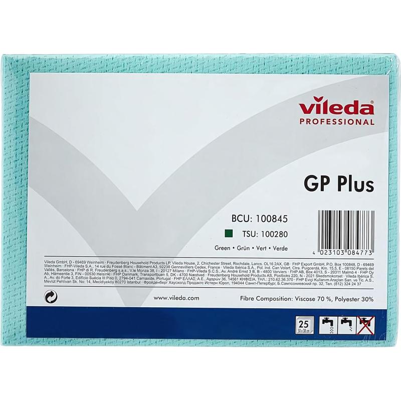 Салфетки хозяйственные повышенной впитываемости Vileda Professional GP Plus вискоза 50×35 см 62 г/кв.м зелёные (25 штук в упаковке)<br><br>Салфетка большого размера ДжиПи Плюс от Vileda Professional предназначена для профессиональной уборки и протирки поверхностей. Подходит для однодневного использования.<br>Для удобства уборки салфетки представлены в четырёх цветах: синий (арт. 732837), красный (арт. 732838), жёлтый (арт. 732839), зелёный (арт. 732840).<br><br>Салфетка ДжиПи Плюс эффективно очищает ежедневные загрязнения с использованием моющих средств. Подходит для ежедневной уборки любых поверхностей, в том числе столов на предприятиях общественного питания.<br>Применяется в профессиональной уборке методом ’ведро-вода’ или спрей-методом.<br><br>Особенности и преимущества: <br>— благодаря пористой структуре салфетка хорошо собирает грязь и быстро сохнет;<br>— хорошо собирает влагу и отжимается;<br>— увеличенный размер салфетки помогает убирать большую площадь за один раз;<br>— 4 цвета для цветовой кодировки и исключения перекрёстных загрязнений;<br>— салфетка рекомендована к применению как однодневная.<br><br>Область применения:<br>Идеальна для уборки коммерческой недвижимости, производств, HoReCa и клининга.<br><br>Салфетка ДжиПи Плюс — это высококачественный инструмент для эффективной, экологичной и профессиональной уборки.<br><br>Характеристики: <br>— толщина: 0,95 мм;<br>— вес: 14 г;<br>— максимальная впитываемость в сухом состоянии: 780 % от собственного веса;<br>— страна производства: Китай.