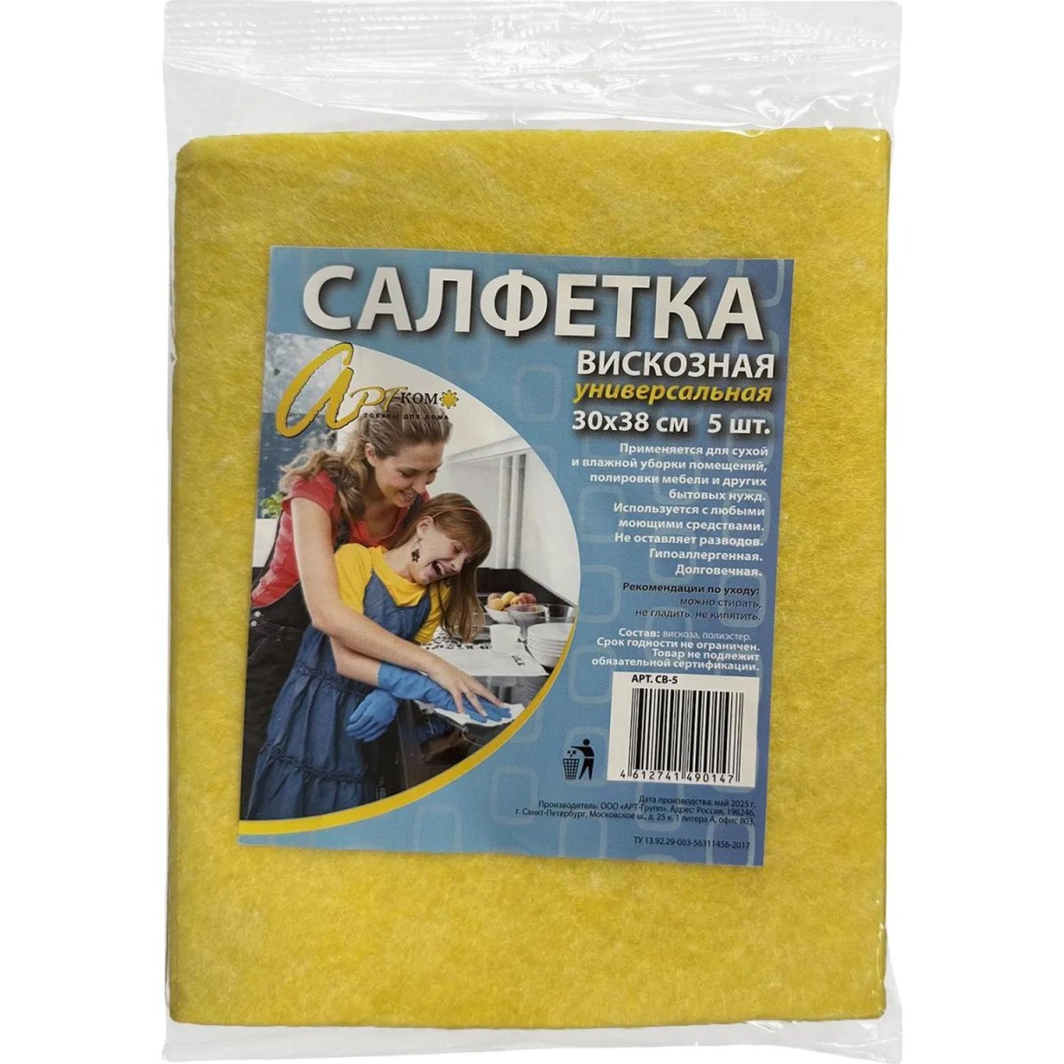 Салфетки хозяйственные повышенной впитываемости вискоза 38×30 см 90 г/кв.м жёлтые (5 штук в упаковке)<br><br>Быстро и эффективно очищают все виды поверхностей от пыли и грязи. Не оставляют разводов и ворсинок. Отлично впитывают влагу. Легко выжимаются и быстро сохнут.<br>Поставляются по 5 штук в упаковке.