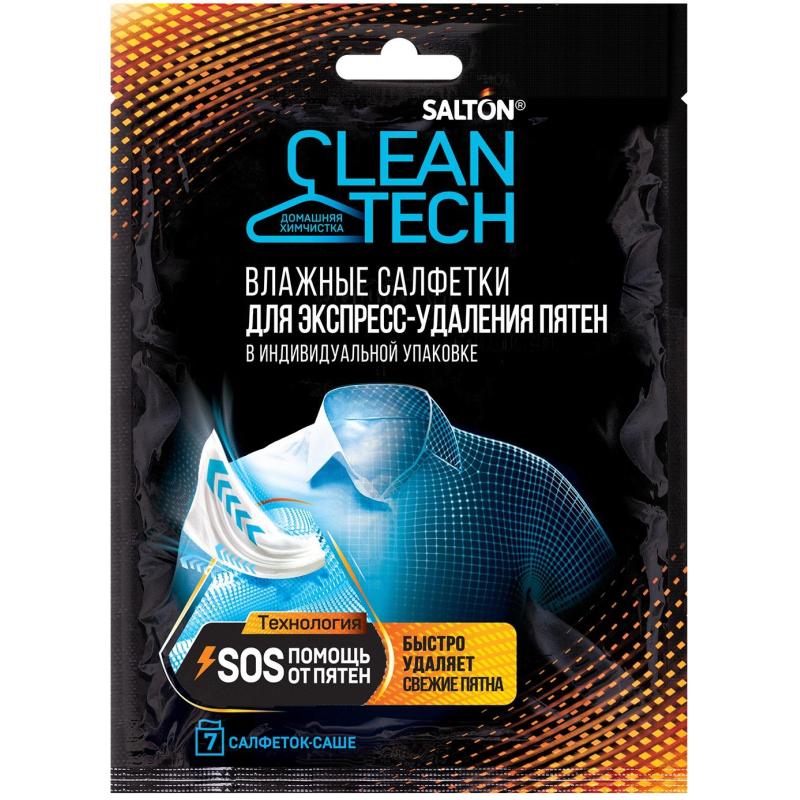 Салфетки влажные для удаления пятен Salton CleanTech (7 штук в упаковке)<br><br><b>Назначение:</b> салфетки пропитаны эффективным составом против свежих загрязнений разной природы, которые могут возникнуть в самый неожиданный момент. Не повреждают ткани и безопасны для кожи рук. Благодаря индивидуальной упаковке салфетки герметично закрыты и долго не высыхают. Удобны в использовании и легко брать с собой в любой ситуации.<br><b>Способ применения:</b> вскрыть упаковку и извлечь салфетку. Под пятно подложить впитывающую ткань. Круговыми движениями обработать загрязнение влажной салфеткой Salton CleanTech.<br><b>Меры предосторожности:</b> Избегать прямого контакта с глазами и слизистой оболочкой. Если произошло попадание содержимого салфетки в глаза, промыть их большим количеством воды и обратиться к офтальмологу. Хранить в местах, недоступных детям и животным, избегать случайного проглатывания. Использовать одноразово, выбрасывать использованные салфетки после каждого применения. Не применять на поврежденной коже, царапинах или открытых ранах. Проветривать помещение после обработки больших поверхностей или большого количества предметов. Тестировать воздействие на маленьком участке ткани, если используете впервые на новых вещах, чтобы избежать повреждения материала. При раздражениях на коже прекратить применение и проконсультироваться с врачом. Соблюдать осторожность при обработке шелковых изделий, так как некоторые чистящие составы могут повредить нежные ткани.<br><b>Состав:</b> ≤30% вода деминерализованная; <5%: н-ПАВ, гликолевый эфир, изопропанол, стабилизатор, отдушка, консервант, полимер.<br><b>Условия хранения:</b> Температура +15...+25 °C, сухое место, хранить вне досягаемости детей и животных. Держать подальше от продуктов питания.<br><b>Срок годности:</b> 5 лет с даты изготовления (дату изготовления см. на упаковке).