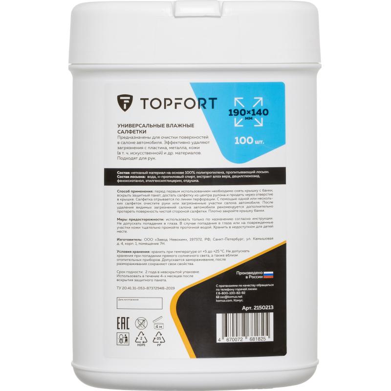 Салфетки универсальные TOPFORT 140×190 мм (100 штук в упаковке, 2150213)<br><br>Универсальные влажные салфетки для очистки от загрязнений пластиковых, металлических и других поверхностей в салоне автомобиля. Благодаря тому, что салфетки пропитаны высококачественным чистящим составом, они прекрасно справляются с сильным загрязнением. Эти салфетки отлично подходят и для рук. Состав лосьона безопасен для организма, и после применения салфеток, не требуется дополнительно мыть руки. Благодаря ароматизированной пропитке после применения салфеток остаётся ощущение свежести и чистоты. Данные универсальные салфетки удобны в применении, идеальны в условиях отсутствия воды. Отвечают современным санитарно-гигиеническим нормам, содержат смягчающие и увлажняющие компоненты, препятствующие раздражению рук.<br><br>Способ применения: перед первым использованием необходимо снять крышку с банки, вскрыть защитный пакет, достать салфетку из центра рулона и продеть через отверстие в крышке. Салфетка отрывается по линии перфорации. С помощью одной или нескольких салфеток очистите руки или загрязнённые участки салона автомобиля. После удаления видимых загрязнений салона автомобиля рекомендуется дополнительно протереть поверхность чистой стороной салфетки. Плотно закройте крышку банки.<br>Использовать в течение 4-х месяцев после вскрытия защитного пакета.<br><br>Условия хранения: хранить при температуре от +5 до +25 °С. Не допускать хранения при попадании прямого солнечного света, а также вблизи отопительных приборов. Допускается замораживание, после размораживания сохраняют свои свойства.<br><br>Состав: нетканый материал на основе 100% полипропилена, пропитывающий лосьон.<br>Состав лосьона: вода, н-пропиловый спирт, экстракт алоэ вера, децилглюкозид, феноксиэтанол, этилгексилглицерин, отдушка.<br><br>Меры предосторожности: использовать только по назначению согласно инструкции. Не допускать попадания в глаза. В случае попадания в глаза или на повреждённые участки кожи тщательно промойте проточной водой.<br>Хранить в недоступном для детей месте.<br><br>Особенности:<br>• 100 шт. в тубе.<br>• Размер салфетки: 140×190 мм.<br>• Универсальные. Широкая сфера применения.<br>• Безопасны для кожи — можно использовать для рук.<br>• Приятный аромат.<br><br>Внешний вид и/или характеристики товара могут быть изменены производителем в соответствии с производственным процессом.