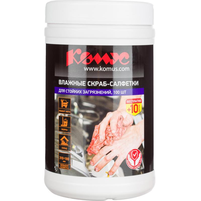 Износоустойчивые, не царапающие салфетки серии '<nobr>СУПЕР-СКРАБ</nobr>' с уникальными абразивными полипропиленовыми волокнами, пропитанные высококачественным чистящим составом предназначены для глубокой бережной очистки рук и поверхностей от сильных загрязнений. Большой размер салфетки (310×180 мм). В банке 100 штук салфеток 10 штук в подарок.<BR><BR>Благодаря специальным нитеобразным абразивным волокнам и эффективному чистящему составу салфетки быстро и с минимальными усилиями удаляют строительные, жировые и масляные загрязнения, остатки смазок, клеев, герметиков, воска, смол, битумных и антикоррозийных составов, топлива, сажи, следы от шин и каблуков, никотина, ручек и фломастеров, других трудно удаляемых веществ, оставляя при этом ощущение чистоты и свежести. Успешно очищают белую подошву обуви.<BR><BR>Удобны в применении, идеальны в условиях отсутствия воды. Рекомендуются для удаления стойких загрязнений с рук и поверхностей в автомобиле, офисе, на производстве и дома. Влажные<nobr>скраб-салфетки</nobr> отвечают современным <nobr>санитарно-гигиеническим</nobr> нормам, содержат смягчающие и увлажняющие компоненты, препятствующие раздражению кожи рук.<BR><BR><!--noindex-->Внешний вид и/или характеристики товара могут быть изменены производителем в соответствии с производственным процессом.<!--/noindex-->