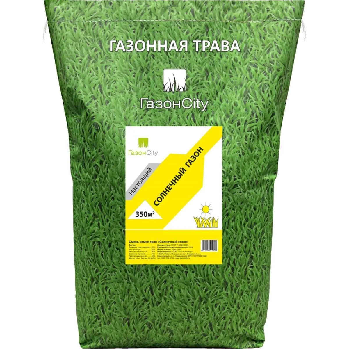 Семена газонной травы Газонcity Солнечный газон 10 кг<br><br>Семена газонной травы «Солнечный газон» серии «Настоящий Газон» от Газонcity предназначены для создания устойчивого травяного покрытия на открытых участках с засушливым климатом или ограниченным поливом. Эта травосмесь подходит для частных и общественных территорий, где требуется плотный и выносливый газон с минимальными требованиями к уходу.<br><br>Смесь состоит из многолетних злаков, адаптированных к солнечным условиям. Благодаря высокому уровню засухоустойчивости газон сохраняет декоративность даже при длительном отсутствии дождей и нерегулярном орошении. Он хорошо приживается в открытом грунте и устойчив к неблагоприятным погодным условиям.<br><br>Посев возможен в период с марта по октябрь. Упаковки весом 10 кг достаточно для покрытия до 350 кв. м площади. Произведено в России.