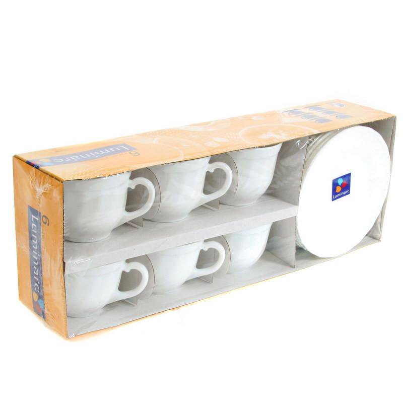 Набор чайный Luminarc Трианон (E8845) на 6 персон стекло (12 предметов).<br><br>Чайный сервиз Luminarc «Трианон» предназначен для шести персон и включает шесть чашек и шесть блюдец. Чашки объёмом 220 мл выполнены из гладкого закалённого стекла белого цвета. Посуда устойчива к повреждениям и перепадам температуры благодаря специальной обработке. <br><br>Толщина стенок составляет 3 мм, что обеспечивает дополнительную прочность. Набор упакован в эргономичную фирменную упаковку, что делает его удобным для хранения и транспортировки. Данный сервиз можно использовать в микроволновой печи и мыть в посудомоечной машине. Диаметр блюдец — 14 см.