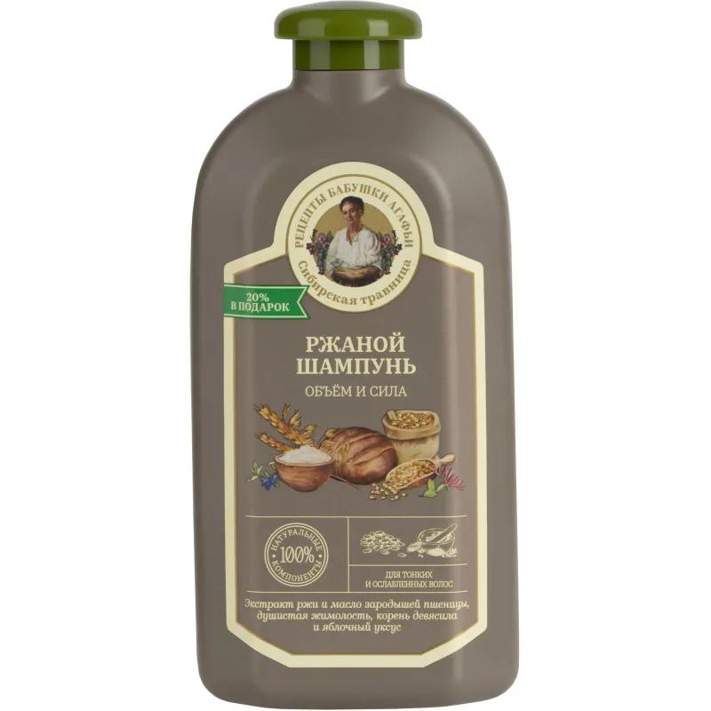 Шампунь Рецепты бабушки Агафьи Сибирская Травница Ржаной для жирных/тонких и повреждённых волос 500 мл<br><br>Тонким волосам объём требуется, чтобы причёска выглядела роскошно и пышно. В этом деле поможет шампунь «Объём и сила». Он приготовлен на основе ржаного и дрожжевого экстрактов — проверенных веками средств для здоровья волос.<br>Экстракт ржи помогает уменьшить жирность кожи головы, он утолщает волосы по всей длине и придаёт упругий объём от корней. Дрожжевой экстракт их питает и росту способствует. Жимолость волосы смягчает, девясил укрепляет, а яблочный уксус делает блестящими.<br>Шампунь ржаной каждый день используйте и наслаждайтесь видом своих сильных и густых волос.<br>Способ применения: нанесите шампунь на влажные волосы, массирующими движениями взбейте в пену и смойте тёплой водой. При необходимости повторите процедуру.<br>Состав: Aqua with infusions of Secale Cereale Seed Extract (экстракт ржи), Yeast Extract (экстракт дрожжей), Lonicera Caprifolium Flower Extract (экстракт цветков жимолости), Inula Helenium Extract (экстракт девясила), Apple Cider Vinegar (яблочный уксус); Triticum Vulgare Germ Oil (масло зародышей пшеницы), Sodium Laureth Sulfate, Cocamidopropyl Betaine, Coco-Glucoside, Guar Hydroxypropyltrimonium Chloride, Benzyl Alcohol, Sodium Benzoate, Potassium Sorbate, Sodium Chloride, Citric Acid, Parfum, Caramel, CI 15985.