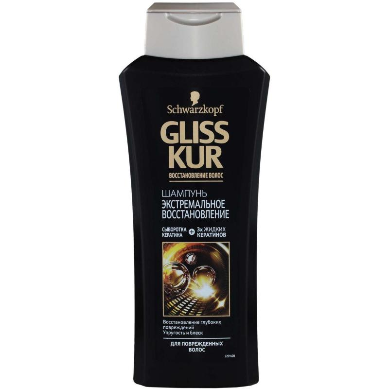 Шампунь Глисс Кур Экстремальное Восстановление 400 мл<br><br>Предназначен для поврежденных и сухих волос. Формула с тройной концентрацией жидких кератинов придает волосам больше упругости и блеска, защищает и ухаживает, восстанавливая их структуру и уменьшая ломкость. Подходит для ежедневного применения.<br>Состав: aqua, sodium laureth sulfate, cocamidopropyl betaine, sodium chloride, peg-7 glyceryl cocoate, guar hydroxypropyltrimonium chloride, hydrolyzed keratin, tocopheryl acetate, panthenol, simmondsia chinensis seed oil, disodium cocoamphodiacetate, sodium benzoate, citric acid, dimethicone, peg-40 hydrogenated castor oil, parfum, cocamide mea, hydrogenated castor oil, peg-120 methyl glucose dioleate, mica, laureth-4, laureth-23, linalool, limonene, benzyl salicylate, propylene glycol, ci 77891.<br>Способ применения: нанести на влажные волосы, затем тщательно смыть.