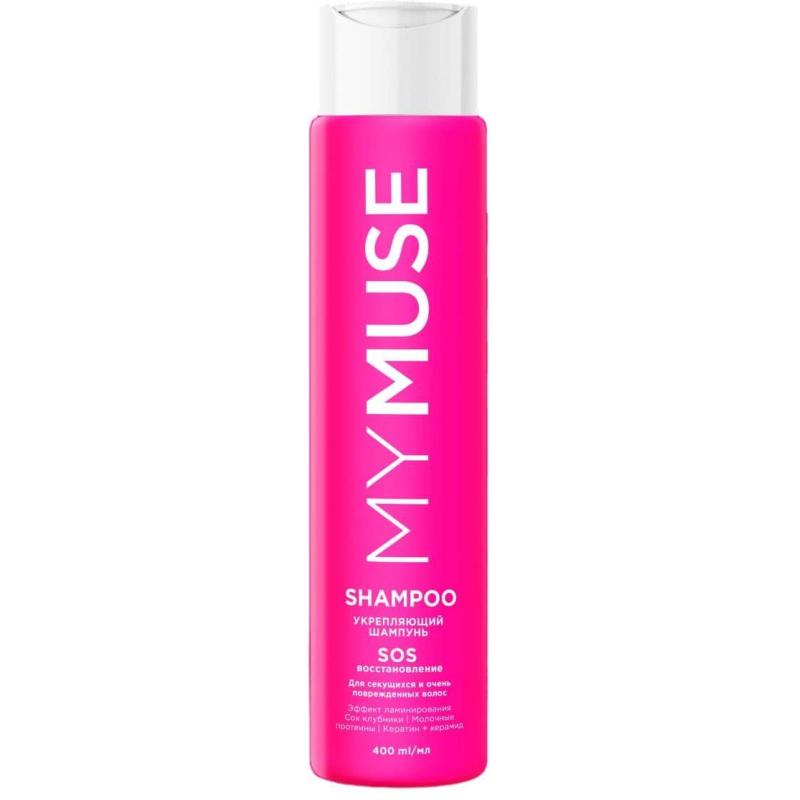 Шампунь MyMuse для повреждённых волос 400 мл<br><br>Назначение: Кератин увлажняет и питает, улучшает структуру волос. Молочные протеины эффективно питают волосы, способствуют их росту и регенерации. Сок клубники увлажняет, придаёт блеск и восстанавливает структуру волос.<br>Способ применения: Нанесите на влажные волосы, вспеньте, смойте. При необходимости повторить. Рекомендуем использовать с бальзамом этой серии.<br>Состав: Aqua, Sodium Laureth Sulfate, Cocamidopropyl Betaine, Cocamide DEA, PEG-7 Glyceril Cocoat, Polyquaternium-7, Sodium Chloride, Fragrance, salt EDTA, Citric Acid, Phenoxyethanol, Hydrolyzed keratin, Fragaria vesca (strawberry) fruit extract, Hydrolyzed milk protein, dye.<br>Срок годности: 36 месяцев.