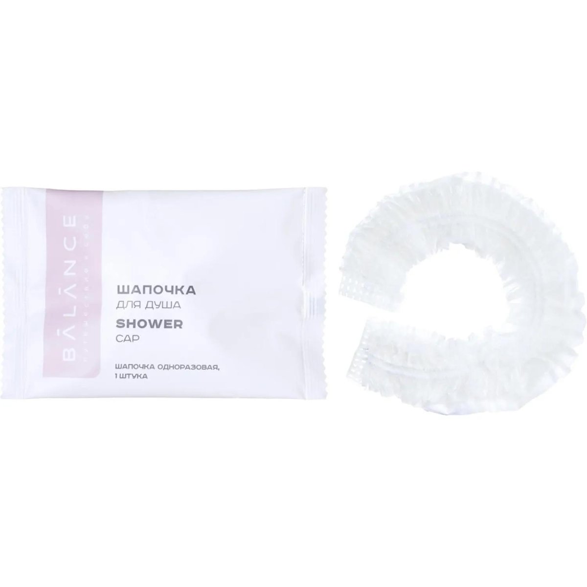 Шапочка для душа Balance предназначена для защиты волос от влаги во время водных процедур. Изделие выполнено из полиэтилена, имеет эластичную резинку, которая обеспечивает надёжную фиксацию и комфортное прилегание.<br><br>Шапочка прозрачная, лёгкая и компактная, упакована во флоупак из полипропилена, что гарантирует гигиеничность и удобство хранения. Подходит для использования в гостиницах, поездках и других условиях, где важна индивидуальная упаковка.<br><br>Продукт поставляется упаковками по 500 штук.
