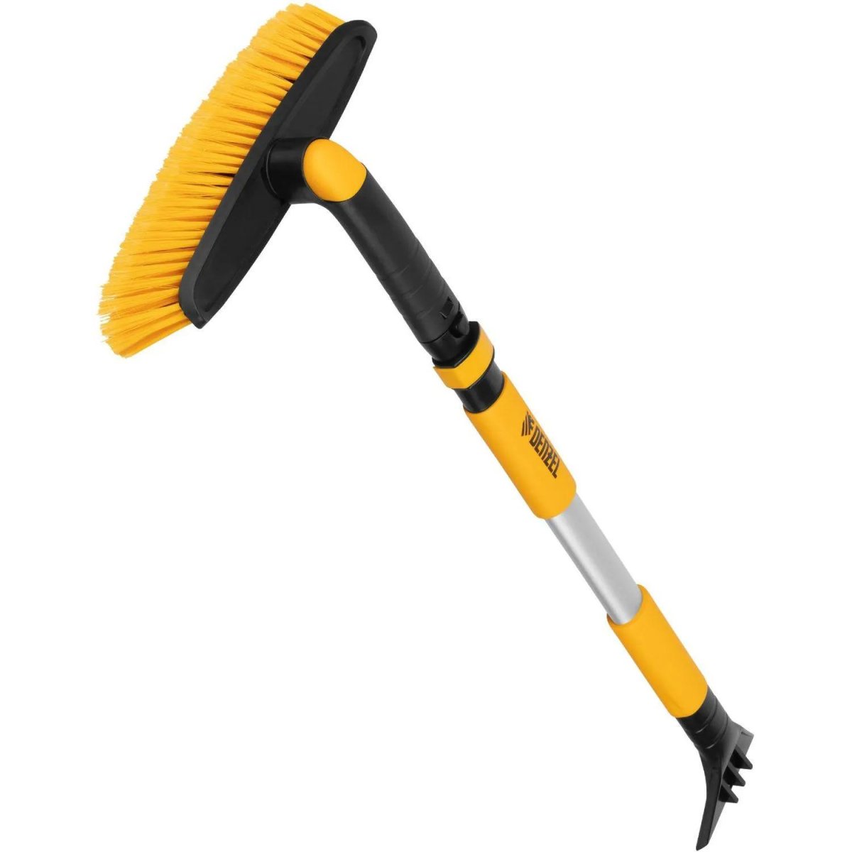 Щётка-скребок Denzel нет (55326)<br><br>Щетка-сметка Denzel 55326 со скребком, поворотной головой и телескопической рукояткой длиной 750-1120 мм предназначена для быстрой и эффективной очистки кузова автомобиля от снега и наледи. Ее использование позволяет сохранить лакокрасочное покрытие автомобиля в хорошем состоянии, а также обеспечивает безопасность водителя и других участников дорожного движения.<br><br>Преимущества<br>• Высокая прочность — усиленный телескопический корпус из легкого алюминиевого сплава выдерживает интенсивную эксплуатацию при температуре до −40 ℃.<br>• Регулировка длины — рукоятка выдвигается и фиксируется на длине 750-1120 мм, за счет чего можно без труда очистить крышу транспортного средства.<br>• Эффективность — скребок шириной 115 мм имеет специальные зубья, поэтому успешно справляется с толстым слоем наледи.<br>• Бережная очистка — особо мягкая распушенная щетина шириной 320 мм не портит лакокрасочное покрытие автомобиля.<br>• Поворотный механизм — щетка фиксируется с шагом 45° в одном из 3 положений.<br>• Удобная эксплуатация — на рукоятке имеется мягкая накладка, благодаря которой работать комфортно даже в сильные морозы.