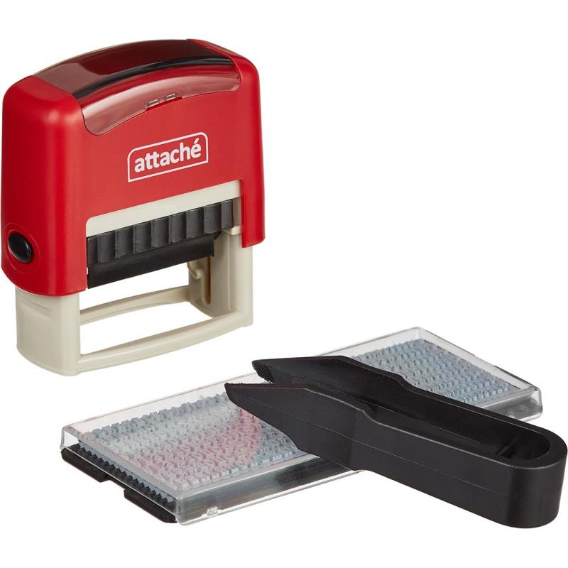 Штамп самонаборный Attache предназначен для самостоятельного создания и изменения текста оттиска. Компактный и надежный пластиковый корпус с автоматическим поворотным окрашивающим механизмом. На корпусе расположено информационное окно для корпоративной или личной персонализации. Легкая и чистая замена штемпельной подушки. Оптимальный набор букв, цифр и символов на двух ножках. Размер поля — 38×14 мм, 3 строки. Комплектация: штамп с рифленой пластиной для набора; одна касса букв: русские буквы, цифры, символы, 3 мм х 360 знаков, синяя сменная штемпельная подушка, пинцет. Внимание! При использовании широких символов (Ж, М, Ф, Ш, Щ, Ю, Ы), цифр, пробелов для набора текста данные по максимальной вместимости символов будут снижаться. Также символы рекомендуется размещать с отступом от края (внутрь) в случае использования разных шрифтов.