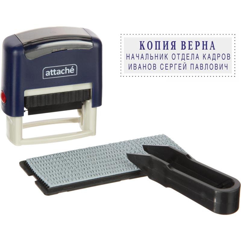 <p>Штамп самонаборный Attache предназначен для самостоятельного создания и изменения текста оттиска. Компактный и надежный пластиковый корпус с автоматическим поворотным окрашивающим механизмом. Легкая и чистая замена штемпельной подушки. Оптимальный набор букв, цифр и символов. Размер оттиска — 38×14 мм. Максимальное количество строк: 3. Максимальное количество знаков в каждой строке — 20 основным шрифтом. Максимальное количество знаков: 60. Комплектация: штамп с рифленой пластиной для набора, пинцет.</p>