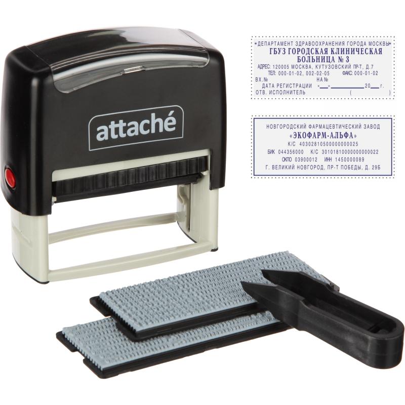 <p>Штамп самонаборный Attache с рамкой предназначен для самостоятельного создания и изменения текста оттиска. Компактный и надежный пластиковый корпус с автоматическим поворотным окрашивающим механизмом. Легкая и чистая замена штемпельной подушки. Оптимальный набор букв, цифр и символов. Размер оттиска — 70×32 мм. Максимальное количество строк: 6. Максимальное количество знаков в каждой строке — 33 основным шрифтом. Максимальное количество знаков: 198. Комплектация: штамп с рифленой пластиной для набора, пинцет.</p>