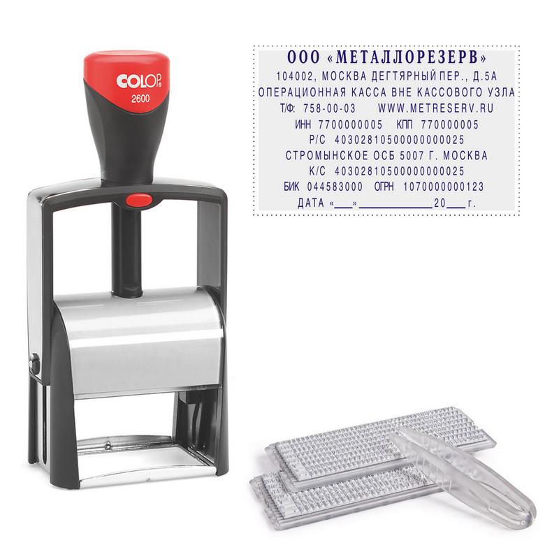 Самонаборные штампы очень популярны, функциональны, и просто незаменимы, когда нужно срочно создать или исправить штамп с наименованием, адресом, реквизитами компании или подразделения, с должностью и инициалами сотрудника и т. д. Это практично и удобно, так как не требует дополнительного изготовления клише, и экономит время. Нужный текст можно самостоятельно набрать при помощи пинцета и касс букв, цифр и символов, которыми комплектуются все штампы. Текст набирается зеркально справа налево на всем поле штампа или в его центральной части. От каждого края (справа и слева) необходимо отступить 1-2 мм, чтобы текст не выходил за границы пазов и равномерно окрашивался. При замене текста в самонаборных печатях и штампах рекомендуется заменять штемпельную подушку для гарантии четкого корректного оттиска.<br> Преимущества:<br> — В самонаборных штампах Colop на 1 строку текста больше, чем у штампов других марок аналогичного размера при той же высоте шрифта, за счет меньшего межстрочного интервала — оттиск выглядит гармоничнее!<br> — В каждой строке помещается на 4% больше символов, чем у аналогов других марок с той же высотой шрифта! — Экспресс-набор текста — в 1.5 раза быстрее за счет крепления на 1 ножку! Символы крепятся прочно и оперативно в пазы рифленой пластины, количество которых равно количеству строк.<br> — Универсальная касса содержит на 33,3% больше букв, цифр и символов, чем у других производителей! Комплектация Colop Printer 2600-Set:<br> — долговечная, износостойкая оснастка с металлическим каркасом, предназначена для интенсивного использования с автоматическим окрашиванием и рифленой пластиной 37×58 мм для набора 9 строк текста;<br> — универсальная касса букв Type Set A (арт. 621847) и дополнительная касса Type Set B (арт.621848);<br> — синяя сменная штемпельная подушка E/2600 (арт. 114149);<br> — пинцет;<br> — упаковка;<br> — блистер.<br> Максимальное количество знаков в каждой строке: основной шрифт 2.2 мм — 36; большой шрифт 3.1 мм — 27. Внимание! При использовании для набора текста широких символов (Ж, М, Ф, Ш, Щ, Ю, Ы), большого количества пробелов, а также при комбинации шрифтов 2.2 мм и 3.1 мм, данные по максимальной вместимости символов будут снижаться.<br> Внимание! Все сменные штемпельные подушки, которыми комплектуется продукция Colop, заправлены краской Noris (Германия) на водной основе с добавлением глицерина и предназначены для проставления оттисков на бумагу и пористые поверхности. При необходимости проставления оттисков на другие поверхности спиртсодержащей краской при помощи автоматической оснастки, стандартную подушку, идущую в комплекте, необходимо заменить на специальную совместимую со спиртосодержащими красками, во избежание затвердевания подушечного материала. Заказывается индивидуально.