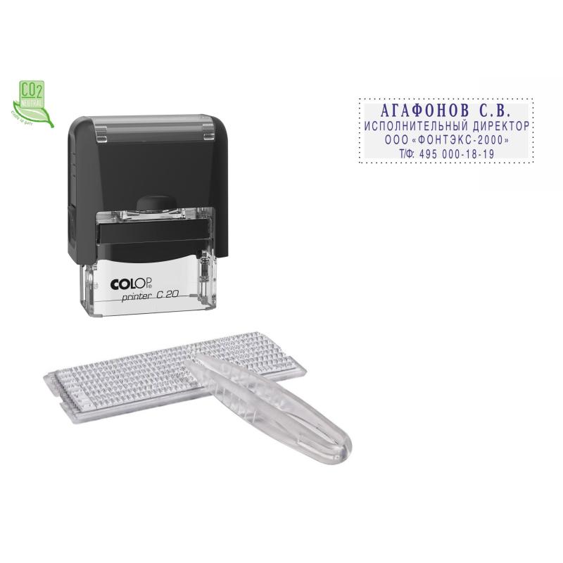 Самонаборные штампы очень популярны, функциональны, и просто незаменимы, когда нужно срочно создать или исправить штамп с наименованием, адресом, реквизитами компании или подразделения, с должностью и инициалами сотрудника <nobr>и т. д.</nobr> Это практично и удобно, так как не требует дополнительного изготовления клише, и экономит время. Нужный текст можно самостоятельно набрать при помощи пинцета и касс букв, цифр и символов, которыми комплектуются все штампы. Текст набирается зеркально справа налево на всем поле штампа или в его центральной части. От каждого края (справа и слева) необходимо отступить 1–2 мм, чтобы текст не выходил за границы пазов и равномерно окрашивался. При замене текста в самонаборных печатях и штампах рекомендуется заменять штемпельную подушку для гарантии четкого корректного оттиска. <BR>Преимущества:<BR>— В каждой строке помещается на 14% больше символов, чем у аналогов других марок с той же высотой шрифта!<BR>— <nobr>Экспресс-набор</nobr> текста — в 1,5 раза быстрее за счет крепления на 1 ножку! Символы крепятся прочно и оперативно в пазы рифленой пластины, количество которых равно количеству строк.<BR>— Универсальная касса, А содержит на 33.3% больше букв, цифр и символов, чем у других производителей!<BR>— Обновленный дизайн корпуса штампа: инновационный механизм фиксации клавишами, устойчивость в перевернутом положении, встроенные антискользящие элементы и высокое расположение текстовой платы делают работу с ним еще более комфортной.<BR><BR>Комплектация Colop Printer <nobr>С20-Set</nobr>:<BR>— компактная и надежная пластиковая оснастка с автоматическим окрашиванием и рифленой пластиной 14×38 мм для набора 4 строк текста;<BR>— универсальная касса букв Type Set A (арт. 621847);<BR>— синяя сменная штемпельная подушка E/20 (арт. 3252);<BR>— пинцет;<BR>— упаковка: блистер.<BR><BR>Максимальное количество знаков в каждой строке:<BR>основной шрифт 2,2 мм — 25;<BR>большой шрифт 3,1 мм — 17.<BR><BR>Внимание! При использовании для набора текста широких символов (Ж, М, Ф, Ш, Щ, Ю, Ы), большого количества пробелов, а также при комбинации шрифтов 2,2 мм и 3,1 мм, данные по максимальной вместимости символов будут снижаться.<BR>Внимание! Все сменные штемпельные подушки, которыми комплектуется продукция Colop, заправлены краской Noris (Германия) на водной основе с добавлением глицерина и предназначены для проставления оттисков на бумагу и пористые поверхности. При необходимости проставления оттисков на другие поверхности спиртсодержащей краской при помощи автоматической оснастки, стандартную подушку, идущую в комплекте, необходимо заменить на специальную совместимую со спиртосодержащими красками, во избежание затвердевания подушечного материала. Заказывается отдельно.<BR>