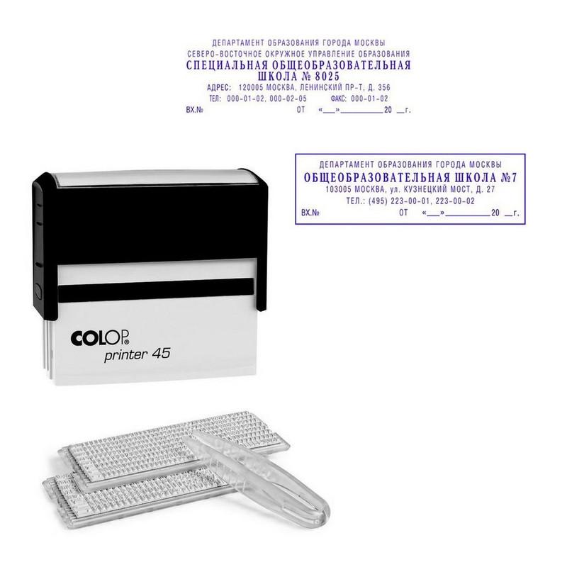 Самонаборные штампы очень популярны, функциональны, и просто незаменимы, когда нужно срочно создать или исправить штамп с наименованием, адресом, реквизитами компании или подразделения, с должностью и инициалами сотрудника и т. д. Это практично и удобно, так как не требует дополнительного изготовления клише, и экономит время. Нужный текст можно самостоятельно набрать при помощи пинцета и касс букв, цифр и символов, которыми комплектуются все штампы. Текст набирается зеркально справа налево на всем поле штампа или в его центральной части. От каждого края (справа и слева) необходимо отступить 1-2 мм, чтобы текст не выходил за границы пазов и равномерно окрашивался. При замене текста в самонаборных печатях и штампах рекомендуется заменять штемпельную подушку для гарантии четкого корректного оттиска.<br> Преимущества:<br> — В самонаборных штампах Colop на 1 строку текста больше, чем у штампов других марок при той же высоте шрифта, за счет меньшего межстрочного интервала — оттиск выглядит гармоничнее!<br> — В каждой строке помещается на 4% больше символов, чем у аналогов других марок с той же высотой шрифта!<br> — Экспресс-набор текста — в 1.5 раза быстрее за счет крепления на 1 ножку! Символы крепятся прочно и оперативно в пазы рифленой пластины, количество которых равно количеству строк.<br> — Универсальная касса, А содержит на 33,3% больше букв, цифр и символов, чем у других производителей!<br> — Съемная рамка в комплекте (нет аналогов!) крепится по контуру рифленой пластины, занимая верхнюю и нижнюю строки, таким образом уменьшая количество свободных строк на 2 (например, в штампе всего 6 строк, а при использовании рамки, остается 4 строки для текста).<br> Комплектация Colop Printer 45-Set-F: — компактная и надежная пластиковая оснастка с автоматическим окрашиванием и рифленой пластиной 25×82 мм для набора 7 строк текста без использования рамки и 5 строк с рамкой;<br> — съемная рамка;<br> — универсальная касса букв Type Set A (арт. 621847) и дополнительная касса Type Set B (арт.621848);<br> — синяя сменная штемпельная подушка E/45 (арт. 73904);<br> — пинцет;<br> — упаковка;<br> — блистер.<br> Максимальное количество знаков в каждой строке: без рамки: основной шрифт 2.2 мм — 51; большой шрифт 3.1 мм — 38; с рамкой: основной шрифт 2.2 мм — 47; большой шрифт 3.1 мм — 34. Внимание! При использовании для набора текста широких символов (Ж, М, Ф, Ш, Щ, Ю, Ы), большого количества пробелов, а также при комбинации шрифтов 2.2 мм и 3.1 мм, данные по максимальной вместимости символов будут снижаться. Внимание! Все сменные штемпельные подушки, которыми комплектуется продукция Colop, заправлены краской Noris (Германия) на водной основе с добавлением глицерина и предназначены для проставления оттисков на бумагу и пористые поверхности. При необходимости проставления оттисков на другие поверхности спиртсодержащей краской при помощи автоматической оснастки, стандартную подушку, идущую в комплекте, необходимо заменить на специальную совместимую со спиртосодержащими красками, во избежание затвердевания подушечного материала. Заказывается индивидуально.