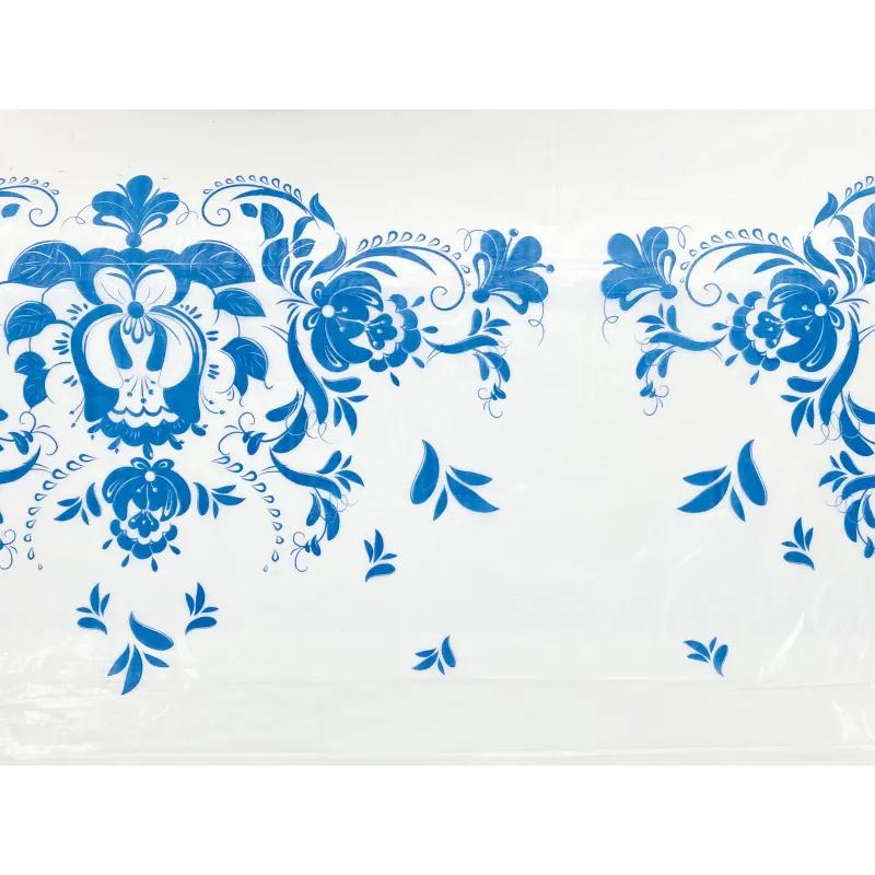 Скатерть одноразовая Plushe Гжель ПВД 110×180 см белая (5 штук в упаковке)<br><br>Скатерть ПВД однослойная с рисунком. Удобная и практичная кухонная принадлежность, которая предназначена для защиты поверхности кухонного стола от загрязнения и порчи. Одноразовая скатерть незаменима в местах общественного питания, в офисах и в домашнем быту.<br>Скатерть белого цвета с синим рисунком.<br>Размер: 110×180 см.<br>В упаковке 5 штук.
