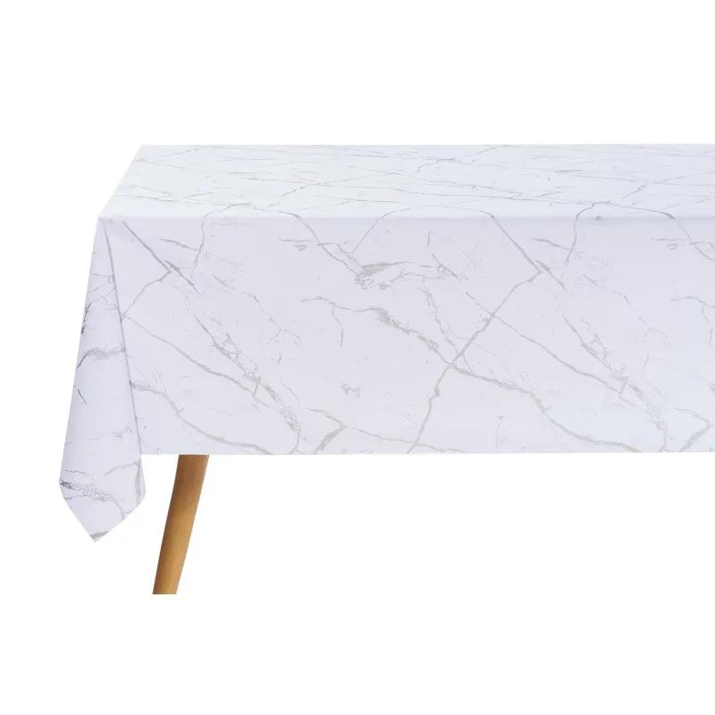 Скатерть на стол прямоугольная Dekorelle 140×160 см ПВХ белая/серебряная<br><br>Клеёнка на тканевой основе с тиснением «рубчик». Поверхность имитирует натуральную хлопковую скатерть, создавая уют и подчёркивая стиль интерьера. Материал прочный, влагостойкий и легко очищается. При плотности 330 г/кв.м и толщине 0.35 мм изделие сохраняет форму и остаётся аккуратным даже при регулярном использовании.<br><br>Внимание! Перед первым использованием обязательна стирка!
