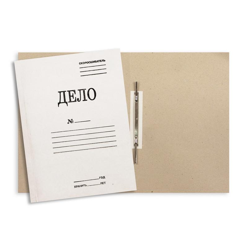 Папка-скоросшиватель Дело № формата А4 изготовлена из белого немелованного картона (плотность 360 г/кв.м). Оснащена металлическим механизмом сшивания, скоросшиватель крепится с внешней стороны. Длина усиков составляет 45-50 мм. Ширина корешка данного скоросшивателя составляет от 20 до 25 мм. Вместимость — до 200 листов стандартной плотности. Папки-скоросшиватели упакованы в гофрокороба по 200 штук. Допуск по размерам +/-2 мм. Стоимость указана за штуку.<br>Папки могут поставляться с разным шрифтом.