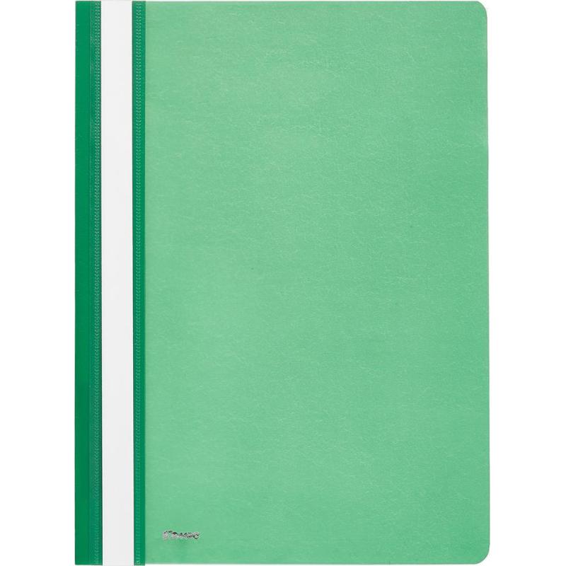 <p>Скоросшиватель используется для хранения различного рода документации, для ведения документооборота, систематизации договоров, других важных бумаг. Папка изготовлена из гладкого пластика. Размер изделия составляет 230×309 мм, что чуть больше формата А4. Толщина верхнего прозрачного листа — 130 мкм, нижнего цветного листа — 180 мкм. С прозрачной верхней обложкой. На лицевой стороне находится карман с белым бумажной полосой для указания содержания, вместимость — 100 листов стандартной плотности. Цвет- зеленый.</p>