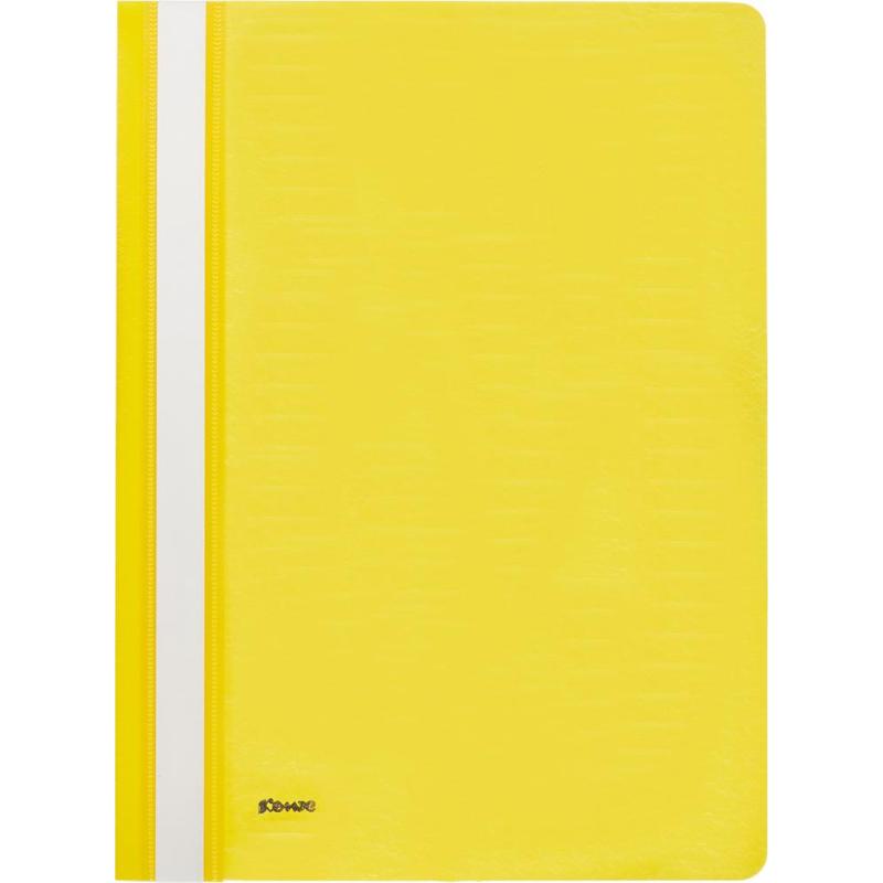 Скоросшиватель используется для хранения различного рода документации, для ведения документооборота, систематизации договоров, других важных бумаг. Папка изготовлена из гладкого пластика. Толщина верхнего прозрачного листа — 130 мкм, нижнего цветного листа — 180 мкм. С прозрачной верхней обложкой. На лицевой стороне находится карман с белым бумажной полосой для указания содержания, вместимость — 100 листов стандартной плотности. Цвет — жёлтый, цвет скоросшивателя может отличаться в зависимости от партии.