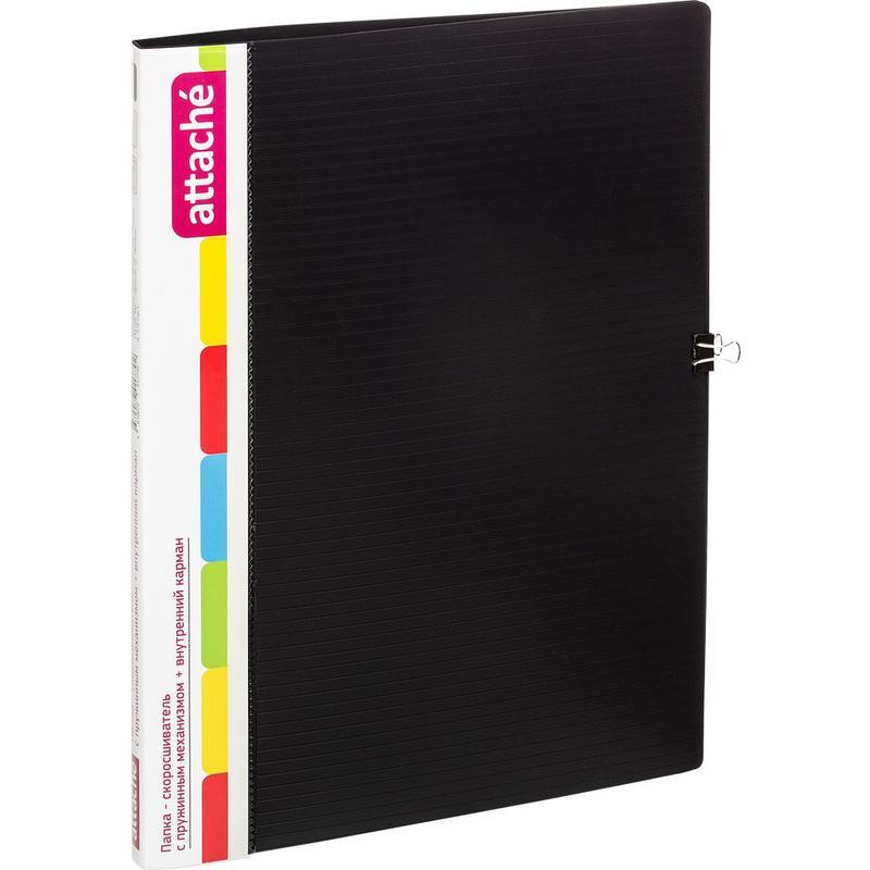 Скоросшиватель с пружинным механизмом Attache используется для хранения различного рода документации, для ведения документооборота, систематизации договоров, других важных бумаг. Формат А4. Папка изготовлена из пропилена толщиной 0,7 мм. Имеет прозрачный карман на левой внутренней обложке для документов. Ширина корешка — 16 мм, вместимость — 200 листов стандартной плотности. Цвет — черный.<BR>1.положите скоросшиватель на горизонтальную поверхность, откройте его;<BR>2.большим и указательным пальцами придайте пружинам вертикальное положение;<BR>3.снимите планку со штырей движением вверх;<BR>4.поместите перфорированные листы внутрь папки на <nobr>штырьки-пружины</nobr>;<BR>5.поверх листов разместите ранее снятую планку, прижмите ее к бумаге;<BR>6.с помощью большого и указательного пальцев разведите <nobr>штырьки-пружины</nobr> в противоположные направления.