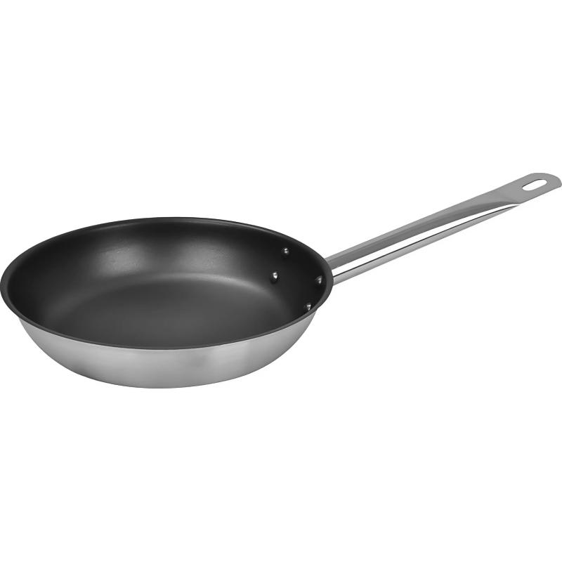 Сковорода нержавеющая сталь 29.5 см с антипригарным покрытием <br><br>Сковорода изготовлена из высококачественной нержавеющей стали 18/10 и имеет трёхслойное капсульное дно толщиной 4.2 мм, которое обеспечивает быстрый и равномерный подогрев пищи и исключает её пригорание. Наличие противопригарного покрытия позволяет готовить блюдо практически без масла. <br>Посуда из нержавеющей стали экологична, гигиенична и проста в эксплуатации. Она устойчива к воздействию кислот и щелочей, в том числе при высоких температурах, устойчива к деформации. В ней можно хранить приготовленное блюдо в холодильнике. <br>Зеркальная полировка стенок сковороды с внешней стороны придаёт ей особо эстетичный и презентабельный вид, который впишется в любой интерьер кухни. Внутренняя гладкая поверхность легко очищается от остатков пищи — можно мыть вручную или в посудомоечной машине. <br>Эргономичная полая ручка сковороды прикреплена надёжными клёпками, что не позволяет ей нагреваться во время приготовления блюда. <br><br>— перед первым использованием требуется тщательно промыть изделия; <br>— хранить изделия в чистом, сухом виде; <br>— не рекомендуется использовать губки с абразивным слоем; <br>— не рекомендуется промывка изделий в посудомоечной машине с использованием моющих средств, в состав которых входит активный кислород.<br> <br> Посуда для профессионального использования создана для ресторанов, кафе и других заведений общественного питания. Прочная, термостойкая и удобная — оптимальное решение для интенсивной работы.