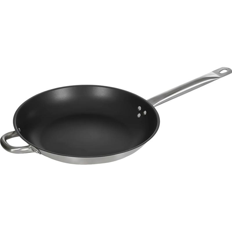 Сковорода нержавеющая сталь 31.5 см с антипригарным покрытием <br><br>Сковорода изготовлена из высококачественной нержавеющей стали 18/10 и имеет трёхслойное капсульное дно толщиной 4.2 мм, которое обеспечивает быстрый и равномерный подогрев пищи и исключает её пригорание. Наличие противопригарного покрытия позволяет готовить блюдо практически без масла. <br>Посуда из нержавеющей стали экологична, гигиенична и проста в эксплуатации. Она устойчива к воздействию кислот и щелочей, в том числе при высоких температурах, устойчива к деформации. В ней можно хранить приготовленное блюдо в холодильнике. <br>Зеркальная полировка стенок сковороды с внешней стороны придаёт ей особо эстетичный и презентабельный вид, который впишется в любой интерьер кухни. Внутренняя гладкая поверхность легко очищается от остатков пищи — можно мыть вручную или в посудомоечной машине. <br>Эргономичная полая ручка сковороды прикреплена надёжными клёпками, что не позволяет ей нагреваться во время приготовления блюда. <br><br>— перед первым использованием требуется тщательно промыть изделия; <br>— хранить изделия в чистом, сухом виде; <br>— не рекомендуется использовать губки с абразивным слоем; <br>— не рекомендуется промывка изделий в посудомоечной машине с использованием моющих средств, в состав которых входит активный кислород.<br> <br> Посуда для профессионального использования создана для ресторанов, кафе и других заведений общественного питания. Прочная, термостойкая и удобная — оптимальное решение для интенсивной работы.