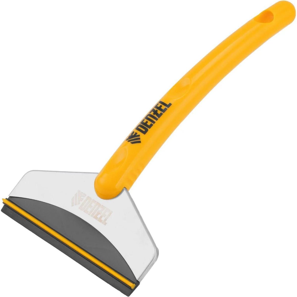 Скребок Denzel (55349)<br><br>Усиленный скребок для удаления льда Denzel 55349 с водосгоном и удлинённой рукояткой предназначен для очищения кузова, стёкол и зеркал автомобиля от снега и наледи. Благодаря усиленной конструкции позволяет справляться даже с плотным снегом и льдом. Незаменим для автовладельцев.<br><br>Преимущества<br>• Надёжность и высокий ресурс — скребок изготовлен из ABS-пластика и нержавеющей стали, выдерживает температуру до −40 °C.<br>• Эффективность — благодаря увеличенным размерам 248×140 мм скребок позволяет быстрее справиться со снегом и наледью<br>• Функциональность — водосгон позволяет эффективно удалять излишки воды с ровных поверхностей.<br>• Комфортная работа — эргономичная изогнутая рукоятка с подпальцевыми выемками надёжно ложится в руку.<br>• Удобное хранение — в рукоятке предусмотрено отверстие для подвешивания.