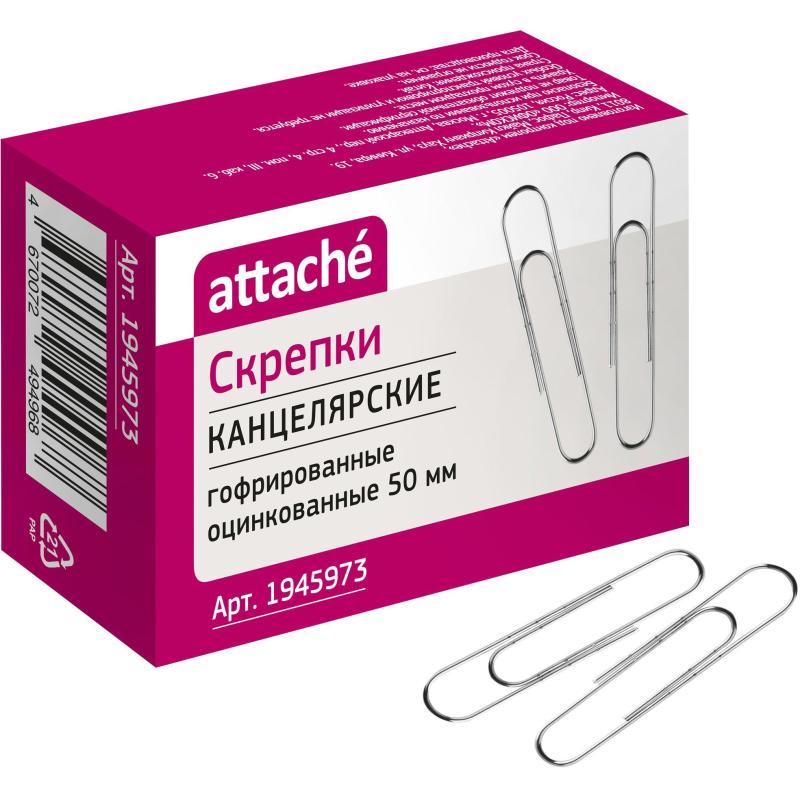 Скрепки Attache незаменимы при работе в офисе или дома, когда нужно соединить несколько бумаг, например, все листы договора или другого документа. Надежно скрепляют документы, не повреждая бумагу. Металлические оцинкованные без покрытия гофрированные. Имеют удобную закругленную форму. Скрепки вложены в картонную коробочку, 50 штук. Размер — 50 мм.