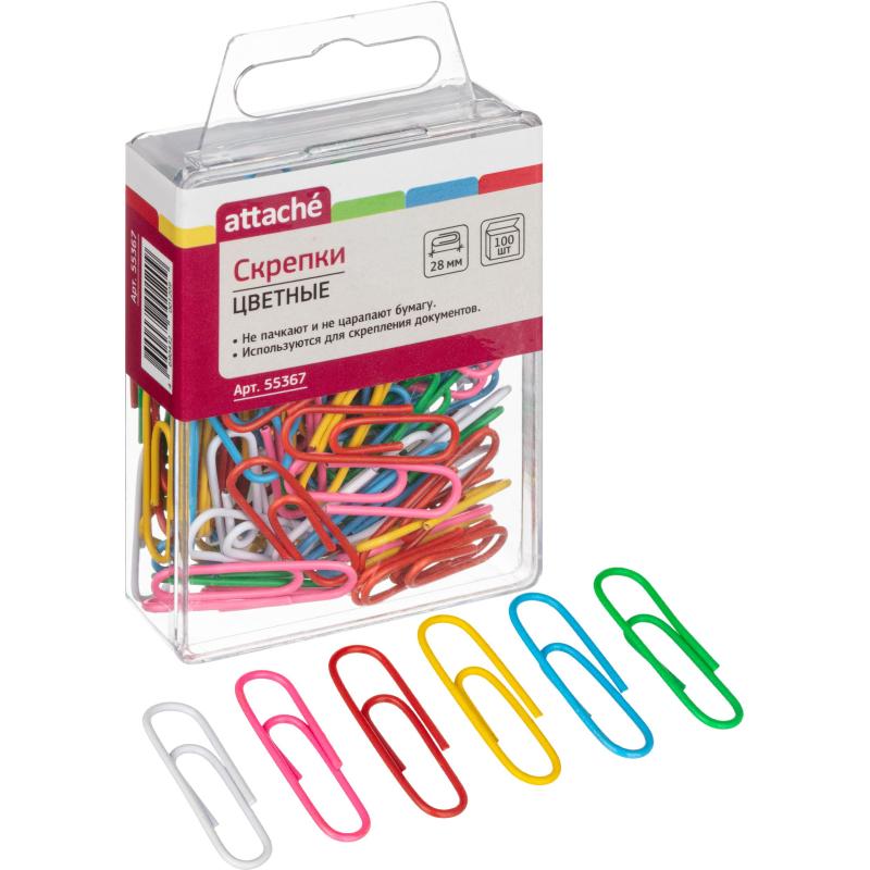 Скрепки Attache незаменимы при работе в офисе или дома, когда нужно соединить несколько бумаг, например, все листы договора или другие важные документы. Скрепки изготовлены из металла с цветным покрытием из пластикового полимера. Имеют удобную закругленную форму, что позволяет надежно скреплять документы. В пластиковой коробочке с подвесом.<br Размер - 28 мм. Разноцветные. В промежуточной упаковке 12 пачек по 100 штук.