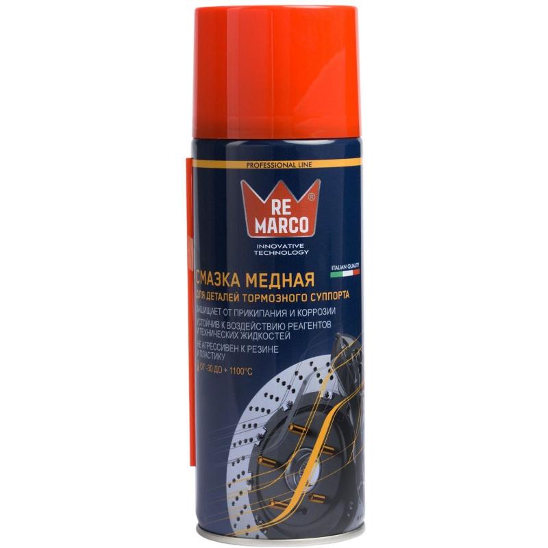 Смазка универсальная Re Marco аэрозоль 400 мл<br><br>Высокотехнологичный состав для защиты и смазки резьбовых соединений и металлических деталей. Продукт отвечающий современным требованиям высоконагруженных узлов, работающих при высоких температурах и под давлением. Применяется для обработки узлов тормозного механизма, соединений выхлопной системы, резьбы свечей зажигания и элементов крепежа. Формула на литиевой основе сохраняет работоспособность до −40°C.<br><br>Отличительной особенностью являются:<br>• Высококачественные компоненты, позволяющие сохранять абсолютно все смазывающие свойства до 600°C (в отличие от большинства аналогов, теряющих эти свойства уже при температуре около 400°C).<br>• Повышенное содержание меди сохраняет разъединительные и защитные свойства в условиях длительного воздействия экстремальных температур до 1100°C.<br>• Повышенная устойчивость к воздействию реагентов, масел, воды и щелочей.<br><br>Внешний вид и/или характеристики товара могут быть изменены производителем в соответствии с производственным процессом.
