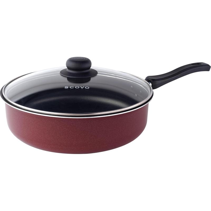 Сотейник Scovo 20 см алюминий с крышкой.<br>Сотейник алюминиевый 20 см и объемом 1.5 л выполнен из штампованного алюминия. Толщина стенки 3 мм, толщина дна 3 мм, высота 6 см. Внутри антипригарное черное покрытие, снаружи жаростойкое цветное лаковое покрытие. <br>В комплекте с сотейником идет стеклянная крышка с бакелитовой бабышкой. Ручка бакелит. <br>Изделие подходит для всех типов плит, кроме индукции. <br>Можно мыть в посудомоечной машине.