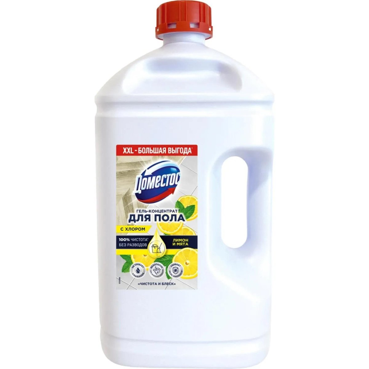<b>Назначение:</b> средство для мытья пола Доместос Лимон и мята.<br><b>Способ применения:</b> для регулярной гигиенической уборки разведите 2 колпачка средства (30 мл) в 5 литрах воды. Вымойте полы, протрите поверхности как обычно. Не нужно смывать. Для антимикробной обработки пола и рабочих поверхностей разведите средство из расчёта 4 колпачка (60 мл) на 1 литр воды. Не нужно смывать. Не используйте неразбавленным!<br>Можно также использовать для мытья и очистки внутренней отделки помещений лечебно-профилактических, санаторно-курортных, детских, дошкольных, школьных и других аналогичных учреждений.<br><b>Меры предосторожности:</b> перед использованием ознакомиться с маркировкой продукта. Содержит хлорактивный компонент. Будьте осторожны при использовании в неразбавленном виде, при обработке деревянных крашеных или лакированных поверхностей. Использовать перчатки и средства защиты лица и глаз. Использовать только в хорошо вентилируемом помещении. Не вдыхать пары. После использования тщательно вымыть руки. При вдыхании: Свежий воздух, покой. При проглатывании: Прополоскать рот. Не вызывать рвоту! При попадании на кожу (или волосы): Немедленно снять всю загрязнённую одежду, кожу промыть водой или под душем. При попадании в глаза: Осторожно промыть глаза водой в течение нескольких минут. Снять контактные линзы, если Вы ими пользуетесь, и если это легко сделать. Продолжить промывание глаз. При необходимости немедленно обратиться за медицинской помощью, по возможности показать маркировку продукта. Не используйте в пищевых целях. Не используйте на металлических поверхностях с эмалированным, золотым или хромированным покрытием. Избегайте попадания на цветную ткань, обивку мебели, ковры из-за возможного обесцвечивания. В случае попадания Доместос на эти поверхности протрите их и тщательно промойте водой. Не смешивайте с другими средствами во избежание образования опасного газа (хлора). Не переливайте содержимое в другие ёмкости. Храните в прохладном месте, в вертикальном положении.<br><b>Состав:</b> <5% гипохлорит натрия, <5% анионные ПАВ, <5% неионогенные ПАВ, <5% мыло, <5% отдушка, <5% эфирное масло апельсина.<br><b>Условия хранения:</b> хранить в сухом защищённом месте без воздействия прямых солнечных лучей при температуре от +5°С до +25°С.<br><b>Срок годности:</b> 18 месяцев с даты изготовления (дату изготовления см. на упаковке).