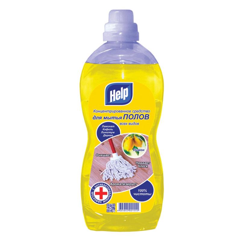 Средство для мытья пола Help Лимон 1 кг универсальное антибактериальное<br><br><b>Назначение:</b> концентрированное средство Help легко и быстро очищает ламинат, кафель, линолеум и деревянные поверхности. Эффективно удаляет загрязнения, придаёт блеск полу и оставляет приятный свежий аромат. Экономично в использовании и не оставляет разводов.<br><b>Способ применения:</b> развести 60 мл средства (2 колпачка) в 5 л воды и вымыть полы. Смывания не требуется. Сильно загрязнённые участки рекомендуется предварительно обработать неразбавленным средством. Для деревянных полов использовать только в разбавленном виде.<br><b>Меры предосторожности:</b> осторожно! При попадании в глаза средство вызывает выраженное раздражение, при попадании на кожу — слабое раздражение. Использовать только по назначению. Рекомендуется применять защитные перчатки. После работы тщательно вымыть руки. Избегать попадания средства в глаза. В случае попадания на кожу или в глаза немедленно промыть чистой водой. При необходимости обратиться к врачу.<br><b>Состав:</b> ≥30% вода; ≥5%, но <15% АПАВ; <5% НПАВ; <5% хлорид натрия; <5% этиленгликоль; <5% цитрат натрия; <5% консервант; <5% парфюмерная композиция (лимонен, линалоол); <5% пеногаситель (силикон); <5% краситель.<br><b>Условия хранения:</b> хранить при температуре не выше +50°C. Средство замерзает, после размораживания и интенсивного встряхивания сохраняет свои свойства.<br><b>Срок годности:</b> 30 месяцев с даты изготовления (дату изготовления см. на упаковке).