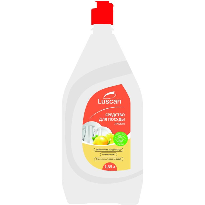 Средство для мытья посуды Luscan Лимон гель 1.35 л<br><br>Создаёт обильную пену. Быстро и эффективно удаляет жир и другие загрязнения, как в горячей, так и в холодной воде. Придаёт посуде блеск. Легко смывается водой. Не раздражает кожу рук.<br><br><b>Способ применения:</b>нанести небольшое количество средства на влажную губку, сжать её рукой до образования пены, протереть губкой грязную посуду и ополоснуть посуду чистой водой. Добавлять средство по мере необходимости в зависимости от количества посуды и степени загрязнения.<br><br><b>Меры предосторожности</b>осторожно. При попадании в глаза вызывает раздражение. Использовать только по назначению. После работы тщательно вымыть руки. Хранить в плотно закрытой упаковке, отдельно от пищевых продуктов, в недоступном для детей месте. Избегать попадания средства в глаза. В случае попадания средства в глаза немедленно промыть их чистой водой. При необходимости обратиться к врачу.<br><br><b>Состав:</b>≥ 30 % вода, ≥ 5 %, но < 15 % АПАВ, < 5 %: хлорид натрия, НПАВ, парфюмерная композиция, тетранатриевая соль этилендиаминтетрауксусной кислоты, лимонная кислота, консервант, краситель.<br><br><b>Условия хранения:</b>хранить при температуре не ниже −20 °C и не выше +50 °C. Средство замерзает, восстанавливает свои свойства после полного размораживания и интенсивного встряхивания.<br><br><b>Срок годности:</b>36 месяцев с даты изготовления (дату изготовления см. на упаковке).